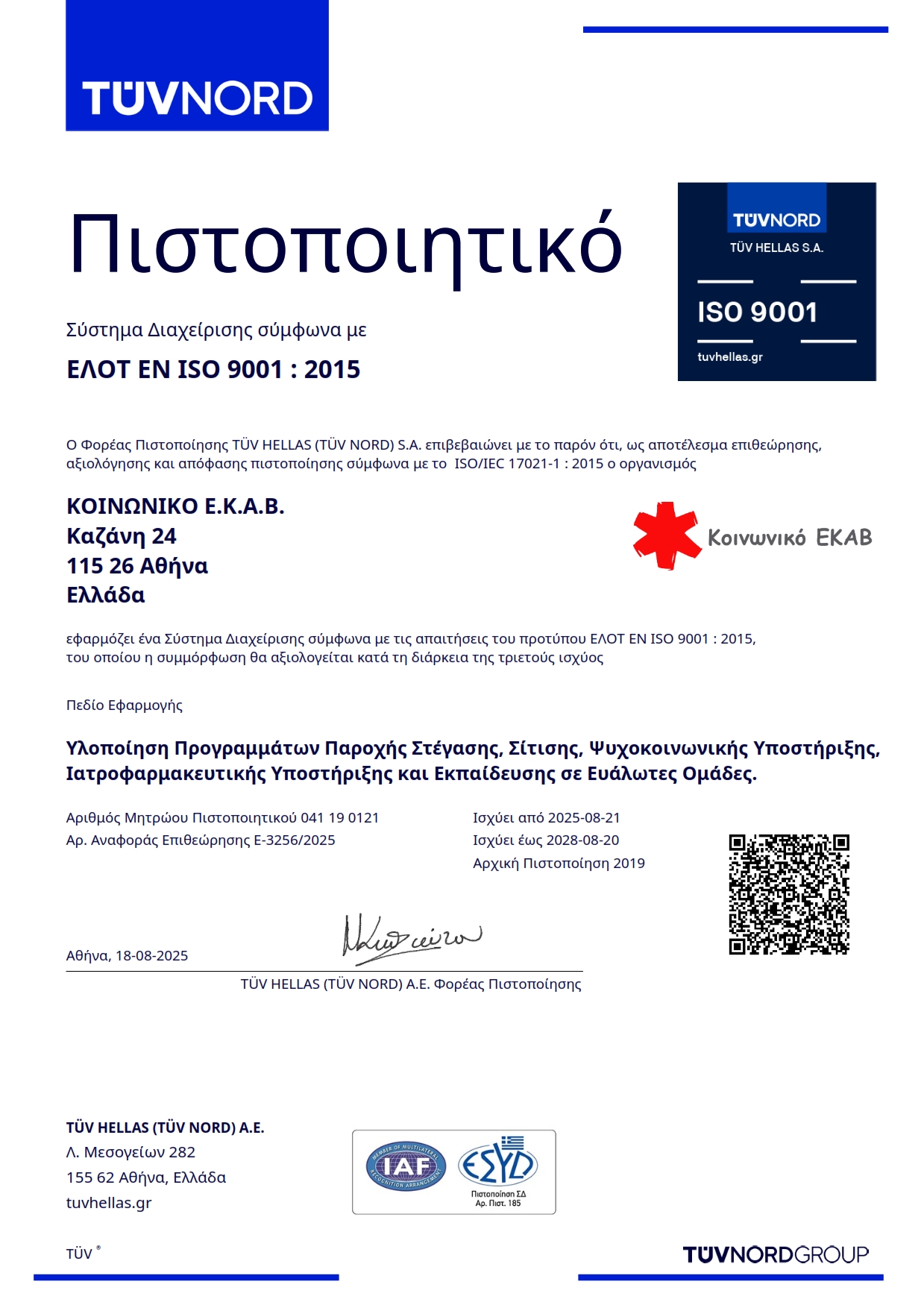 Το Κοινωνικό ΕΚΑΒ έχοντας στόχο, τη συνεχή βελτίωση των παρεχόμενων υπηρεσιών της και την πλήρη ικανοποίηση των απαιτήσεων των προγραμμάτων που υλοποιεί (τόσο σε επίπεδο φυσικού όσο και σε επίπεδο οικονομικού αντικειμένου) έχει πιστοποιηθεί ως φορέας που πληροί τις προϋποθέσεις διαχειριστικής επάρκειας με το ΙSO 9001 : 2015 και πεδίο εφαρμογής «Υλοποίηση Προγραμμάτων Παροχής Στέγασης, Σίτισης, Ψυχοκοινωνικής Υποστήριξης, Ιατροφαρμακευτικής Υποστήριξης και Εκπαίδευσης σε ευάλωτες ομάδες»