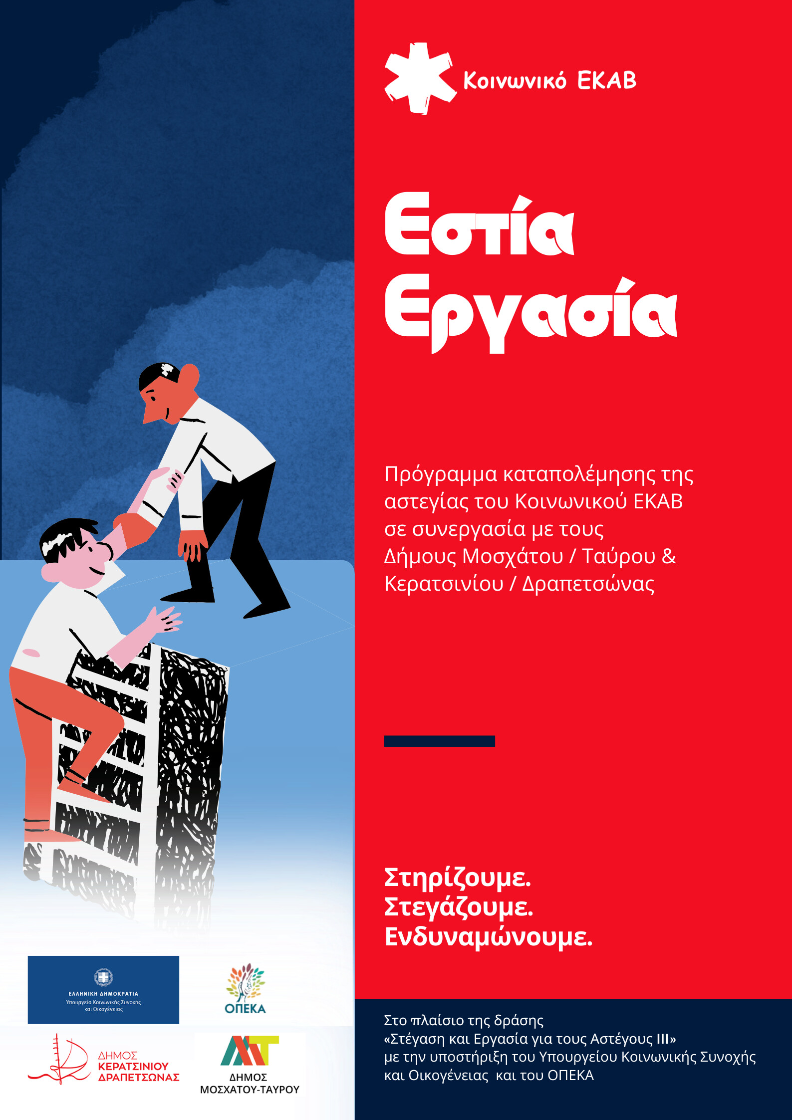 Το Κοινωνικό ΕΚΑΒ, ανταποκρινόμενο στις βασικές ανάγκες της ελληνικής κοινωνίας και πιστό στον στόχο του για την καταπολέμηση κάθε μορφής αποκλεισμού, υλοποίησε την περίοδο 2022–2025 το πρόγραμμα «Εστία – Εργασία Ι», σε συνεργασία με τον Δήμο Νίκαιας – Αγίου Ιωάννη Ρέντη, στο πλαίσιο του σχεδίου «Στέγαση & Εργασία για τους Άστεγους» του Υπουργείου Εργασίας και Κοινωνικών Υποθέσεων, με Αρχή Διαχείρισης τον ΟΠΕΚΑ. Σκοπός του προγράμματος ήταν η παροχή στέγης σε άτομα που διέμεναν σε Δομές Κοινωνικής Ένταξης, σε ακατάλληλα οικήματα ή σε συνθήκες αστεγίας, καθώς και η κοινωνική και εργασιακή τους επανένταξη μέσω συμβουλευτικής, ανάπτυξης δεξιοτήτων και επιχορηγούμενων θέσεων εργασίας. Το πρόγραμμα αυτό αποτέλεσε το πρώτο καθοριστικό βήμα, θέτοντας ισχυρές βάσεις και πολύτιμη εμπειρία.