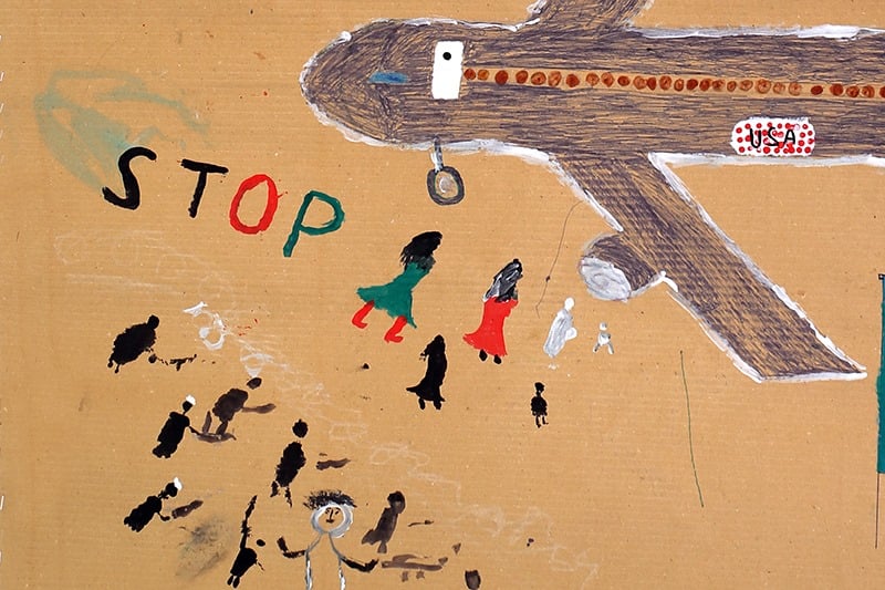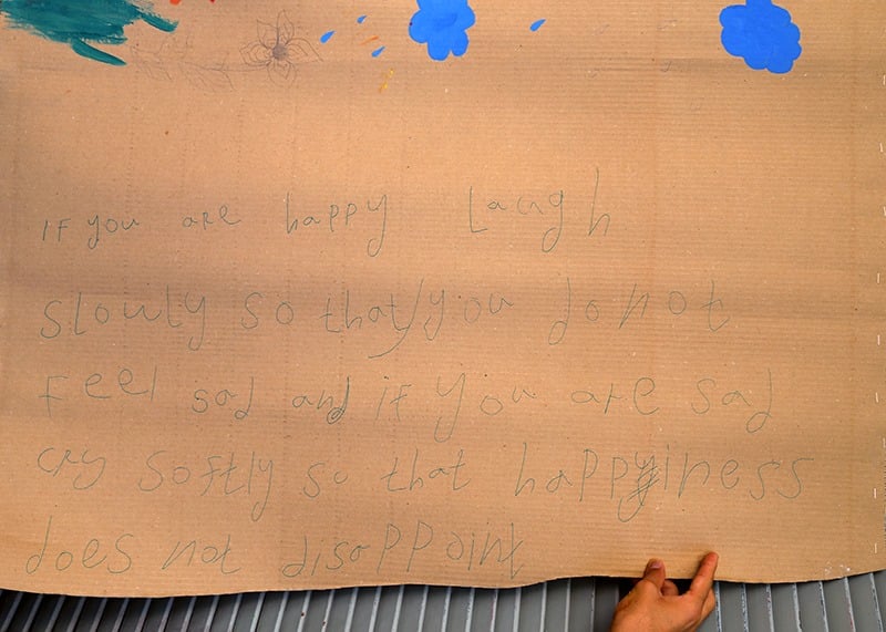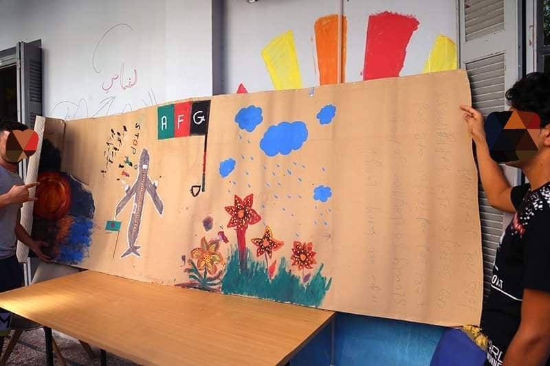 Tous ces sentiments doivent être exprimés, doivent trouver un chemin vers l’extérieur. Ainsi, Katerina et Fèi ont réuni les jeunes et les ont incités à peindre. Les photographies vous montrent le résultat de cette activité. Les jeunes représentent les aléas de la fuite… Les hommes vêtus de noir sont les Talibans dont le fanatisme empêche les gens de tenter de fuir…